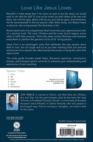Jesus loved verbs. He loved action words such as live, come, rest, learn, hear, give, go and even die. So wouldn't it make sense that the people who claim to follow Jesus would love the same words that Jesus loved? Unfortunately, somewhere along the way someone tried to make the word "Christian" an adjective. So now people speak of "Christian" books and "Christian" music and "Christian" schools. When people use the word "Christian" as an adjective instead of a noun, it loses its meaning. Maybe this explains why so many churches have lost their purpose. In Jesus Prom, Jon Weece explains how our goal as Christians is to become increasingly more like Jesus. Jesus loved people, which means we should love people. We don't "kind of" love people-we love them the way Jesus loves us. We impersonate his every move. If imitation is the greatest form of flattery, Jesus should be flattered by the actions of his Church. This study guide includes discussion questions, video notes, and in-between studies and is designed for use with Jesus Prom: A DVD Study (sold separately).