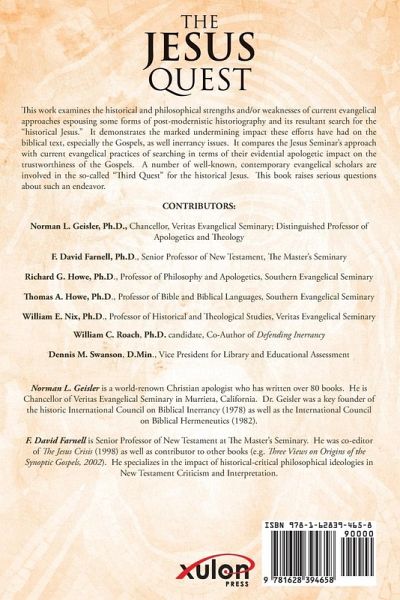 This work examines the historical and philosophical strengths and/or weaknesses of current evangelical approaches espousing some forms of post-modernistic historiography and its resultant search for the "historical Jesus." It demonstrates the marked undermining impact these efforts have had on the biblical text, especially the Gospels, as well inerrancy issues. It compares the Jesus Seminar's approach with current evangelical practices of searching in terms of their evidential apologetic impact on the trustworthiness of the Gospels. A number of well-known, contemporary evangelical scholars are involved in the so-called "Third Quest" for the historical Jesus. This book raises serious questions about such an endeavor. CONTRIBUTORS: Norman L. Geisler, Ph.D., Chancellor, Veritas Evangelical Seminary; Distinguished Professor of Apologetics and Theology F. David Farnell, Ph.D., Senior Professor of New Testament, The Master's Seminary Richard G. Howe, Ph.D., Professor of Philosophy and Apologetics, Southern Evangelical Seminary Thomas A. Howe, Ph.D., Professor of Bible and Biblical Languages, Southern Evangelical Seminary William E. Nix, Ph.D., Professor of Historical and Theological Studies, Veritas Evangelical Seminary William C. Roach, Ph.D. candidate, Co-Author of Defending Inerrancy Dennis M. Swanson, D.Min., Vice President for Library and Educational Assessment Norman L. Geisler is a world-renown Christian apologist who has written over 80 books. He is Chancellor of Veritas Evangelical Seminary in Murrieta, California. Dr. Geisler was a key founder of the historic International Council on Biblical Inerrancy (1978) as well as the International Council on Biblical Hermeneutics (1982). F. David Farnell is Senior Professor of New Testament at The Master's Seminary. He was co-editor of The Jesus Crisis (1998) as well as contributor to other books (e.g. Three Views on Origins of the Synoptic Gospels, 2002). He specializes in the impact of historical-critical philosophical ideologies in New Testament Criticism and Interpretation.