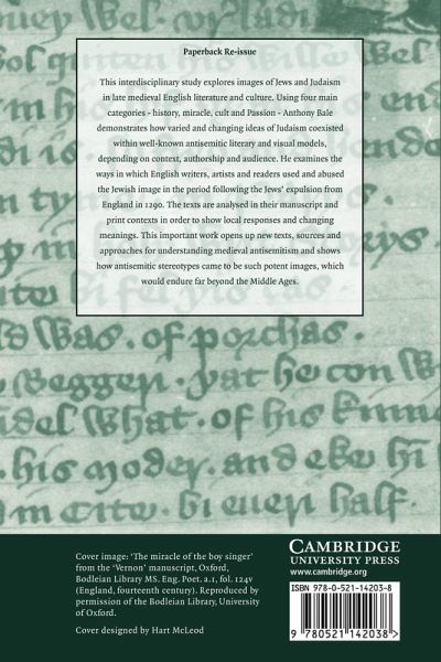 This interdisciplinary study explores images of Jews and Judaism in late medieval English literature and culture. Using four main categories - history, miracle, cult and Passion - Anthony Bale demonstrates how varied and changing ideas of Judaism coexisted within well-known anti-semitic literary and visual models, depending on context, authorship and audience. He examines the ways in which English writers, artists and readers used and abused the Jewish image in the period following the Jews' expulsion from England in 1290. The texts are analysed in their manuscript and print contexts in order to show local responses and changing meanings. This important work opens up fresh texts, sources and approaches for understanding medieval anti-semitism and shows how anti-semitic stereotypes came to be such potent images which would endure far beyond the Middle Ages.