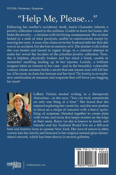 Following her mother's 'accidental' death, Jamie Chancelor inherits a multimillion-dollar jewelry collection. Her cruel stepfather and his son want it, and they beat Jamie so badly in an attempt to get her to tell where she hid the jewelry, that she ends up in a coma. When Jamie awakens, the terror continues: she is in a state of non-movement and has amnesia. Jamie's doctor, having fallen deeply in love with her, helps her recover her memory and then, working with the FBI, develops an escape plan to keep his beloved out of the clutches of the insane father-son duo. With The Jewelry, the first book in a series, LaRain Vickers has written a love note to the reader who enjoys a touch of mystery and suspense combined with romance and a flare for the dramatic. The Jewelry supplies the challenge of how to escape the villain, and readers get to enjoy all the delicious twists and turns involved. Vickers' readers enjoy stories about the complexity of winning hearts and protecting them from harm-and The Jewelry delivers.