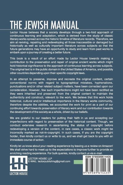 The Jewish Manual: Or Practical Information In Jewish And Modern Cookery, With A Collection Of Valuable Recipes & Hints Relating To The Toilette Edited By A Lady This book is a result of an effort made by us towards making a contribution to the preservation and repair of original classic literature. In an attempt to preserve, improve and recreate the original content, we have worked towards: 1. Type-setting & Reformatting: The complete work has been re-designed via professional layout, formatting and type-setting tools to re-create the same edition with rich typography, graphics, high quality images, and table elements, giving our readers the feel of holding a 'fresh and newly' reprinted and/or revised edition, as opposed to other scanned & printed (Optical Character Recognition - OCR) reproductions. 2. Correction of imperfections: As the work was re-created from the scratch, therefore, it was vetted to rectify certain conventional norms with regard to typographical mistakes, hyphenations, punctuations, blurred images, missing content/pages, and/or other related subject matters, upon our consideration. Every attempt was made to rectify the imperfections related to omitted constructs in the original edition via other references. However, a few of such imperfections which could not be rectified due to intentional\unintentional omission of content in the original edition, were inherited and preserved from the original work to maintain the authenticity and construct, relevant to the work. We believe that this work holds historical, cultural and/or intellectual importance in the literary works community, therefore despite the oddities, we accounted the work for print as a part of our continuing effort towards preservation of literary work and our contribution towards the development of the society as a whole, driven by our beliefs. We are grateful to our readers for putting their faith in us and accepting our imperfections with regard to preservation of the historical content. HAPPY READING!