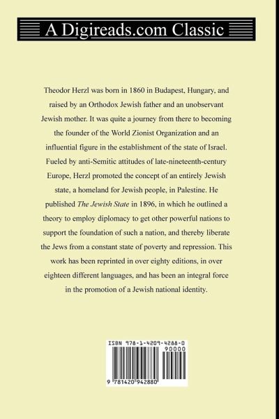 Theodor Herzl was born in 1860 in Budapest, Hungary, and raised by an Orthodox Jewish father and an unobservant Jewish mother. It was quite a journey from there to becoming the founder of the World Zionist Organization and an influential figure in the establishment of the state of Israel. Fueled by anti-Semitic attitudes of late-nineteenth-century Europe, Herzl promoted the concept of an entirely Jewish state, a homeland for Jewish people, in Palestine. He published "The Jewish State" in 1896, in which he outlined a theory to employ diplomacy to get other powerful nations to support the foundation of such a nation, and thereby liberate the Jews from a constant state of poverty and repression. This work has been reprinted in over eighty editions, in over eighteen different languages, and has been an integral force in the promotion of a Jewish national identity.