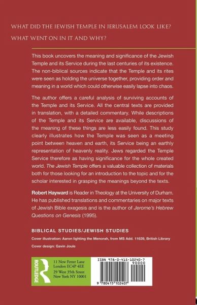Robert Hayward offers a careful analysis of surviving accounts of the Temple and its service. All the central texts are provided in translation, with a detailed commentary. While descriptions of the Temple and its service are available, discussions of the meaning of these things are less easily found. This study clearly illustrates how the Temple was seen as a meeting point between heaven and earth, its service being an earthly representation of heavenly reality. Jews regarded the Temple service therefore as having significance for the whole created world. The Jewish Temple offers a valuable collection of materials both for those looking for an introduction to the topic and for the scholar interested in grasping the meanings beyond those texts.