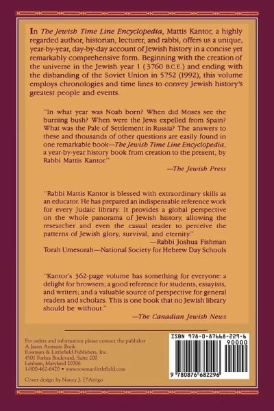 Beginning with the creation of the universe in the Jewish year (3760 B.C.E.) and ending with the Israeli withdrawal from Lebanon in 5745 (1985). This volume employs chronologies and time lines to convey Jewish history's people and events. Kantor writes from the perspective of a traditional Jew, covering events such as the Flood, giving of the Torah, and the fall of the Tower of Babel, placing these within the chronology of history along with the Spanish Inquisition, the Holocaust, and the founding of the State of Israel.