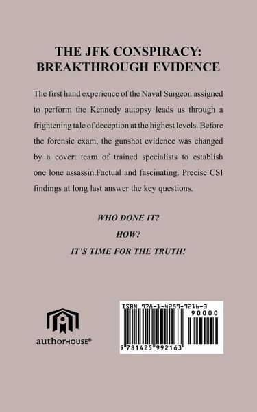 THE JFK CONSPIRACY: BREAKTHROUGH EVIDENCE The first hand experience of the Naval Surgeon assigned to perform the Kennedy autopsy documents a conspiracy at the highest levels. Before the forensic exam , the gunshot evidence was changed by a covert team of specialists. Two wounds from the front became one artificial one from the rear. The new findings became the key evidence for the immediate and final conclusion. There had been one, and only one, shooter. In less than twenty-four hours, the lone assassin had become a permanent part of American history and Lee Harvey Oswald was cast as one of it's great villians. Factual and frightening. Precise CSI technology, painstaking research, and a unique deathbed revelation come together to answer the key questions. WHO DONE IT and HOW HAVE THEY MANAGED TO COVER IT UP?