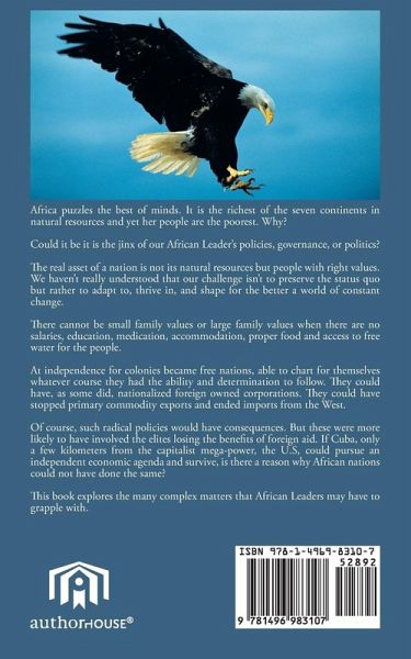 Africa puzzles the best of minds. It is the richest of the seven continents in natural resources and yet her people are the poorest. Why? Could it be it is the jinx of our African Leader's policies, governance, or politics? The real asset of a nation is not its natural resources but people with right values. We haven't really understood that our challenge isn't to preserve the status quo but rather to adapt to, thrive in, and shape for the better a world of constant change. There cannot be small family values or large family values when there are no salaries, education, medication, accommodation, proper food and access to free water for the people. At independence for colonies became free nations, able to chart for themselves whatever course they had the ability and determination to follow. They could have, as some did, nationalized foreign owned corporations. They could have stopped primary commodity exports and ended import from the West. Of course, such radical policies would have consequences. But these were more likely to have involved the elites losing the benefits of foreign aid. If Cuba, only a few kilometers from the capitalist mega-power, the U.S, could pursue an independent economic agenda and survive, is there a reason why African nations could not have done the same? This book explores the many complex matters that African Leaders may have to grapple with.