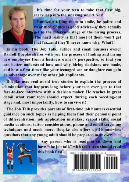 It's time for your young adult to go out and land that very first part-time job. Telling them to smile, be polite and wear nice clothes is all good advice-- if they even get to the interview stage of the hiring process. The hard reality is that most of them won't get that far...and they'll never know why. In his book, The Job Talk, author and multi-small business owner Darrell Doepke shares with you the process of recruiting and hiring new employees from a small business owner's perspective, so that you can better understand how and why hiring decisions are made, and how a first-timer like your teenaged son or daughter can gain an advantage. Doepke uses real-world true stories to explain the process of elimination that happens long before your teen ever gets to a face-to-face interview with a decision maker. He teaches in great detail what to expect during the application and interview process-- and how to prepare for it. It's a weeding-out process, and your young adult needs to know how to survive it!