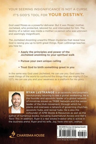 God chooses the insignificant people to do significant things. This book will equip you to pursue God's unique calling on your life even when you feel left out, overlooked, or misunderstood. God used Moses as a powerful deliverer. But it was Moses' mother, Jochebed, who protected, labored, and interceded for him. The destiny of a nation was inside a mother--a person who was unknown and seemingly insignificant. The Jochebed Anointing unearths fifteen mysteries that reveal how God is raising us up to birth great things. Ryan LeStrange teaches us how to do the following: * Apply the principles and power of the Jochebed anointing to our spiritual walk * Pursue our own unique calling * Trust God to birth something great in us In the same way God used Jochebed, He can use us. God uses the weak things of the world to confound the things which are mighty (1 Cor. 1:27). God can use us and our weakness as a platform for His glory. Also Available in Spanish ISBN-13: 978-1-62999-269-3 E-Book ISBN: 978-1-62999-270-9 Other Books by Ryan LeStrange The Power of the Double (2019) ISBN-13: 978-1629996639 Hell's Toxic Trio (2018) ISBN-13: 978-1629994888 Supernatural Access (2017) ISBN-13: 978-1629991689 Overcoming Spiritual Attack (2016) ISBN-13: 978-1629987415