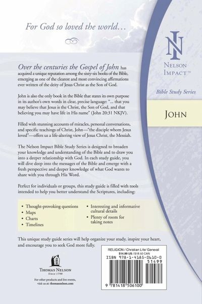 The Nelson Impact Bible Study series will introduce in-depth Bible study to Christian laypeople. Each book will help readers experience the true meaning of the messages in the book of Genesis, and in turn, empower the reader to truly make a difference in the world for Christ. Designed for individual or group study, the study guide will provide a foundation for Bible study and encourage the reader to return to the Bible. All necessary background information will be given so that the reader needs only a Bible and the study guide. The messages will be thorough but easily understood and will be complimented by application questions to guide the readers into a deeper relationship with the Bible that will impact their lives with the gospel of Jesus Christ. Other study guides in the series include: 1 Corinthians ISBN: 1418506192 Exodus ISBN: 1418506168 Genesis ISBN: 1418506087 Isaiah ISBN: 1418506095 John ISBN: 1418506109 Mark ISBN: 1418506184 Romans ISBN: 1418506117 Ruth & Esther ISBN: 1418506176