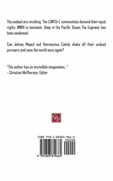 Johnny Moped is pursued by Insurance Agents who wish him to sign the new premiums to rebuild his house. To escape, he takes a canal holiday and discovers his mother is a vampire. Hieronymus Calmly is pursued by Count Vlad Orlok to sign the Patents of Vampiric Nobility over to him. This is a surprise to both of them because neither have vampiric tendencies. Orlok encourages the LGWTQ+Z communities to rise up as the world descends into WW3. And deep in the Marianna Trench, the Engineer has awoken. Johnny Moped (Investigator Extraordinaire) and Sir Hieronymus Calmly (Professor of Perplexing Complexity), reluctantly save the world once again.