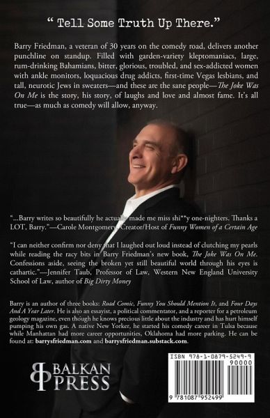 Barry Friedman, a veteran of 30 years on the comedy road, delivers another punchline on standup. Filled with garden-variety kleptomaniacs, large, rum-drinking Bahamians, bitter, glorious, troubled, and sex-addicted women with ankle monitors, loquacious drug addicts, first-time Vegas lesbians, and tall, neurotic Jews in sweaters- and these are the sane people-The Joke Was On Me is the story, his story, of laughs and love and almost fame. It's all true-as much as comedy will allow anyway. ¿ "You can't go on the road with standup comedian Barry Friedman, which is probably good for your health and sanity. But you can feel what it felt like, through this funny, gritty, wondrously detailed, and scarily honest book." Dave Barry "Barry writes so beautifully he actually made me miss shitty one nighters. Thanks A LOT Barry." Carole Montgomery, Host of Funny Women of a Certain Age "He's written a book with all the wisdom and humanity of Alexis de Tocqueville's Democracy in America, but with way better jokes and twice as many clitoral piercings." John H. Richardson "I can neither confirm nor deny that I laughed out loud instead of clutching my pearls while reading the racy bits in Barry Friedman's new book, The Joke Was on Me. Confessions aside, seeing the broken yet still beautiful world through his eyes is cathartic." Jennifer Taub, author of Big Dirty Money