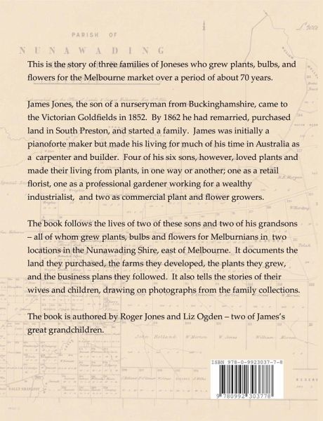 This is the story of three families of Joneses who grew plants, bulbs and flowers for the Melbourne market over a period of about 70 years. It starts with James Jones, son of a nurseryman in England who came to the victorian Goldfields in 1852. The book follows the live of the decendents, documenting the land they purchased and farm they developed. It tells the story of the people and their lives.