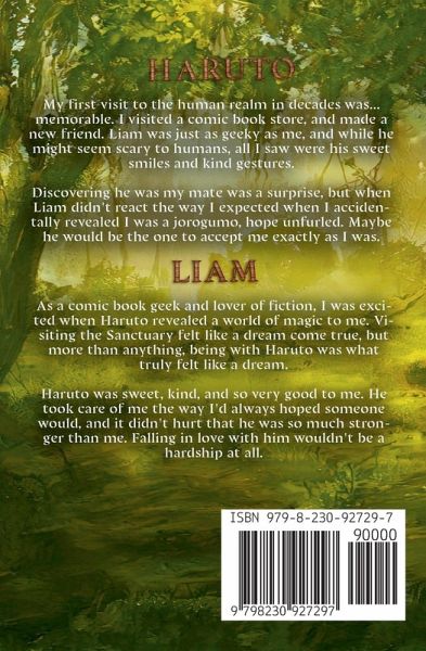 Two fated mates bond over their mutual love of comic books, but when one of them discovers his new friend isn't quite human, will their friendship end or turn into something more? Haruto My first visit to the human realm in decades was... memorable. I visited a comic book store, and made a new friend. Liam was just as geeky as me, and while he might seem scary to humans, all I saw were his sweet smiles and kind gestures. Discovering he was my mate was a surprise, but when Liam didn't react the way I expected when I accidentally revealed I was a jorogumo, hope unfurled. Maybe he would be the one to accept me exactly as I was. Liam As a comic book geek and lover of fiction, I was excited when Haruto revealed a world of magic to me. Visiting the Sanctuary felt like a dream come true, but more than anything, being with Haruto was what truly felt like a dream. Haruto was sweet, kind, and so very good to me. He took care of me the way I'd always hoped someone would, and it didn't hurt that he was so much stronger than me. Falling in love with him wouldn't be a hardship at all. The Jorogumo is a 58k words MM paranormal romance featuring an asexual jorogumo who loves taking care of his partner, a big, strong human with a gentle heart, and a community of supernatural beings living in a safe haven called The Sanctuary. It's the second book in The Sanctuary series, and can be read as a standalone. Note: While one of the MCs does have spider legs and the ability to weave spiderwebs, he does not have a full spider form.
