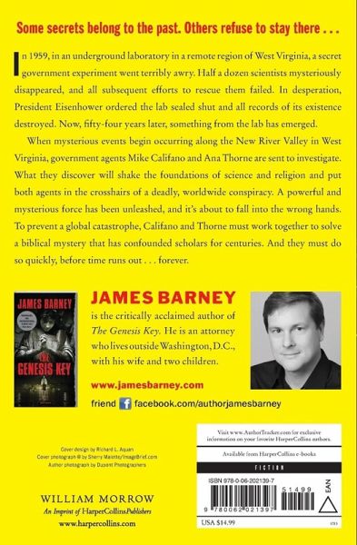 Some secrets belong to the past. Others refuse to stay there . . . In 1959, in an underground laboratory in a remote region of West Virginia, a secret government experiment went terribly awry. Half a dozen scientists mysteriously disappeared, and all subsequent efforts to rescue them failed. In desperation, President Eisenhower ordered the lab sealed shut and all records of its existence destroyed. Now, fifty-four years later, something from the lab has emerged. When mysterious events begin occurring along the New River Valley in West Virginia, government agents Mike Califano and Ana Thorne are sent to investigate. What they discover will shake the foundations of science and religion and put both agents in the crosshairs of a deadly, worldwide conspiracy. A powerful and mysterious force has been unleashed, and it's about to fall into the wrong hands. To prevent a global catastrophe, Califano and Thorne must work together to solve a biblical mystery that has confounded scholars for centuries. And they must do so quickly, before time runs out . . . forever.