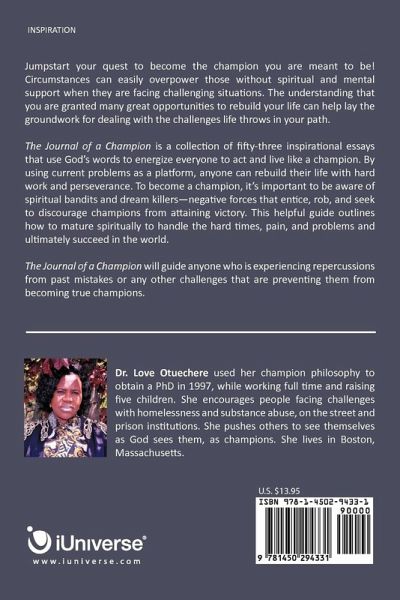 Jumpstart your quest to become the champion you are meant to be! Circumstances can easily overpower those without spiritual and mental support when they are facing challenging situations. The understanding that you are granted many great opportunities to rebuild your life can help lay the groundwork for dealing with the challenges life throws in your path. The Journal of a Champion is a collection of fifty-three inspirational essays that use God's words to energize everyone to act and live like a champion. By using current problems as a platform, anyone can rebuild their life with hard work and perseverance. To become a champion, it's important to be aware of spiritual bandits and dream killers-negative forces that entice, rob, and seek to discourage champions from attaining victory. This helpful guide outlines how to mature spiritually to handle the hard times, pain, and problems and ultimately succeed in the world. The Journal of a Champion will guide anyone who is experiencing repercussions from past mistakes or any other challenges that are preventing them from becoming true champions.