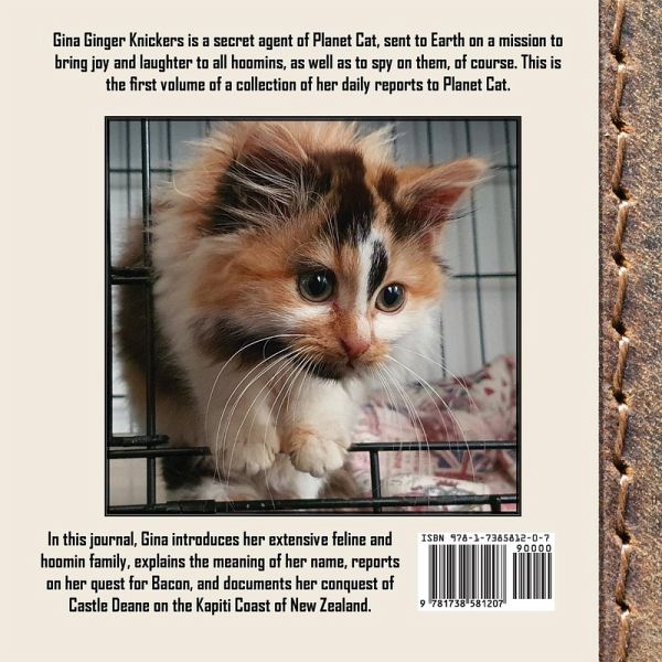 Gina Ginger Knickers is a secret agent of Planet Cat, sent to Earth on a mission to bring joy and laughter to all hoomins, as well as to spy on them, of course. This is the first volume of a collection of her daily reports to Planet Cat. In this journal, Gina introduces her extensive feline and hoomin family, explains the meaning of her name, reports on her quest for Bacon, and documents her conquest of Castle Deane on the Kapiti Coast of New Zealand.