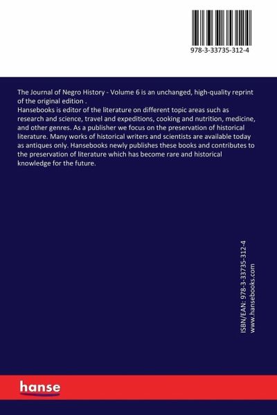 The Journal of Negro History - Volume 6 is an unchanged, high-quality reprint of the original edition .Hansebooks is editor of the literature on different topic areas such as research and science, travel and expeditions, cooking and nutrition, medicine, and other genres. As a publisher we focus on the preservation of historical literature. Many works of historical writers and scientists are available today as antiques only. Hansebooks newly publishes these books and contributes to the preservation of literature which has become rare and historical knowledge for the future.