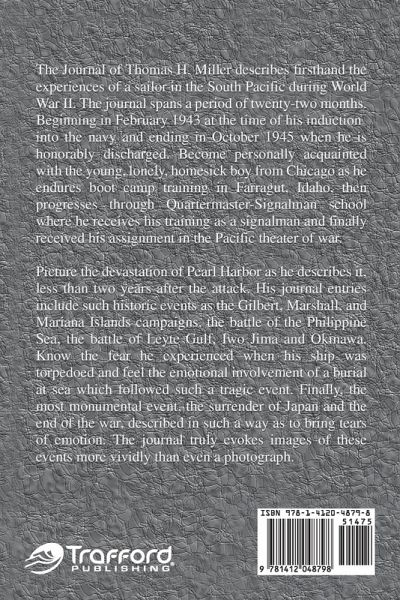 The Journal of Thomas H. Miller describes firsthand the experiences of a sailor in the South Pacific during World War II. The journal spans a period of twenty-two months. Beginning in February 1943 at the time of his induction into the navy and ending in October 1945 when he is honorably discharged. Become personally acquainted with the young, lonely, homesick boy from Chicago as he endures boot camp training in Farragut, Idaho, then progresses through Quartermaster-Signalman school where he receives his training as a signalman and finally received his assignment in the Pacific theater of war. Picture the devastation of Pearl Harbour as he describes it, less than two years after the attack. His journal entries include such historic events as the Gilbert, Marshall, and Mariana Islands campaigns, the battle of the Philippine Sea, the battle of Leyte Gulf, Iwo Jima and Okinawa. Know the fear he experienced when his ship was torpedoed and feel the emotional involvement of a burial at sea which followed such a tragic event. Finally, the most monumental event, the surrender of Japan and the end of the war, described in such a way as to bring tears of emotion. The journal truly evokes images of these events more vividly than even a photograph. Excerpts