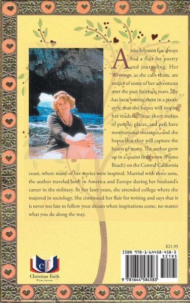 Anna Johnson has always had a flair for poetry and journaling. Her Writings, as she calls them, are stories of some of her adventures over the past fourteen years. She has been writing them in a poetic style that she hopes will inspire her readers. These short stories of people, places, and pets have motivational messages, and she hopes that they will capture the hearts of many. The author grew up in a quaint little town (Pismo Beach) on the Central California coast, where many of her stories were inspired. Married with three sons, the author traveled both in America and Europe during her husband's career in the military. In her later years, she attended college where she majored in sociology. She continued her flair for writing and says that it is never too late to follow your dream when inspirations come, no matter what you do along the way.