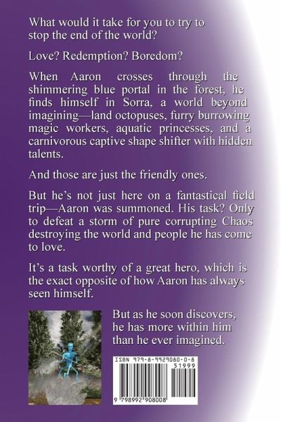 What would it take for you to try to stop the end of the world? Love? Redemption? Boredom? When Aaron crosses through the shimmering blue portal in the forest, he finds himself in Sorra, a world beyond imagining-land octopuses, furry burrowing magic workers, aquatic princesses, and a carnivorous captive shape shifter with hidden talents. And those are just the friendly ones. But he's not just here on a fantastical field trip-Aaron was summoned. His task? Only to defeat a storm of pure corrupting Chaos destroying the world and people he has come to love. It's a task worthy of a great hero, which is the exact opposite of how Aaron has always seen himself. But as he soon discovers, he has more within him than he ever imagined. An all new world with never before seen races.