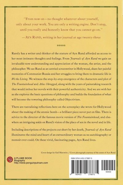 Rarely has a writer and thinker of the stature of Ayn Rand afforded us access to her most intimate thoughts and feelings. From Journals of Ayn Rand, we gain an invaluable new understanding and appreciation of the woman, the artist, and the philosopher, and of the enduring legacy she has left us.Rand comes vibrantly to life as an untried screenwriter in Hollywood, creating stories that reflect her youthful vision of the world. We see her painful memories of communist Russia and her struggles to convey them in We the Living. Most fascinating is the intricate, step-by-step process through which she created the plots and characters of her two masterworks, The Fountainhead and Atlas Shrugged, and the years of painstaking research that imbued the novels with their powerful authenticity. Complete with reflections on her legendary screenplay concerning the making of the atomic bomb and tantalizing descriptions of projects cut short by her death, Journals of Ayn Rand illuminates the mind and heart of an extraordinary woman as no biography or memoir ever could. On these vivid pages, Ayn Rand lives.