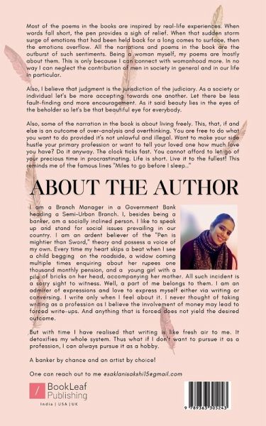 ""Most of the poems in the books are inspired by real-life experiences. When words fall short, the pen provides a sigh of relief. When that sudden storm surge of emotions that had been held back for a long comes to surface, then the emotions overflow. All the narrations and poems in the book are the outburst of such sentiments. Being a woman myself, my poems are mostly about them. This is only because I can connect with womanhood more. In no way I can neglect the contribution of men in society in general and in our life in particular. Also, I believe that judgment is the jurisdiction of the judiciary. As a society or individual let's be more accepting towards one another. Let there be less fault-finding and more encouragement. As it said beauty lies in the eyes of the beholder so let's be that beautiful eye for everybody. Also, some of the narration in the book is about living freely. This, that, if and else is an outcome of over-analysis and overthinking. You are free to do what you want to do provided it's not unlawful and illegal. Want to make your side hustle your primary profession or want to tell your loved one how much love you have? Do it anyway. The clock ticks fast. You cannot afford to let go of your precious time in procrastinating. Life is short. Live it to the fullest! This reminds me of the famous lines """"Miles to go before I sleep..""""""