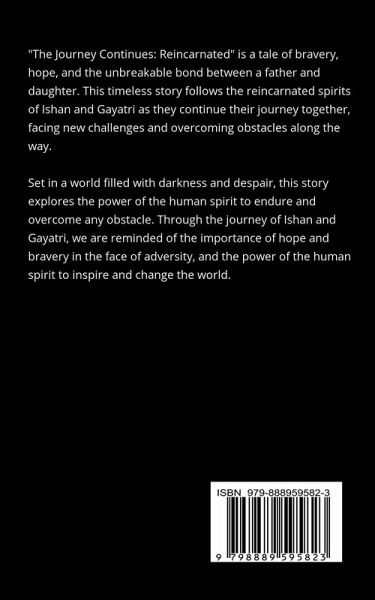 ""The Journey Continues: Reincarnated"" is a tale of bravery, hope, and the unbreakable bond between a father and daughter. This timeless story follows the reincarnated spirits of Ishan and Gayatri as they continue their journey together, facing new challenges and overcoming obstacles along the way. Set in a world filled with darkness and despair, this story explores the power of the human spirit to endure and overcome any obstacle. Through the journey of Ishan and Gayatri, we are reminded of the importance of hope and bravery in the face of adversity, and the power of the human spirit to inspire and change the world. As they journey through this world, they encounter other reincarnated souls, each with their own stories of bravery and hope. Together, they form a community of brave and inspired individuals, determined to bring light to a world filled with darkness. As the story unfolds, we are taken on an emotional and thrilling journey, as Ishan and Gayatri navigate the challenges and obstacles in their path. Through their journey, we are inspired to embrace the spirit of bravery and hope, and to remember the power of the human spirit to endure and overcome any obstacle. ""The Journey Continues: Reincarnated"" is a timeless tale of hope, bravery, and the unbreakable bond between a father and daughter, and an inspiring reminder of the power of the human spirit to endure and overcome any obstacle.
