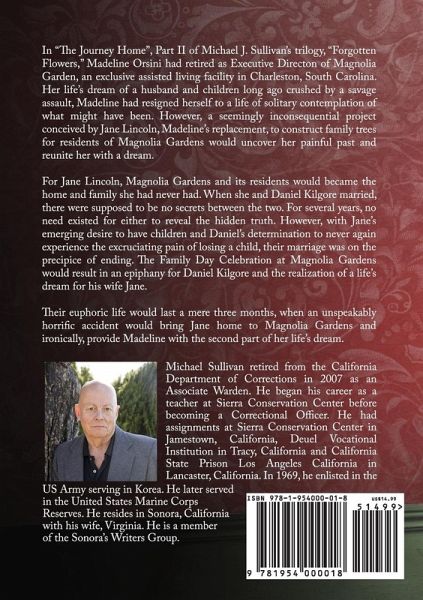 In "The Journey Home" Part II of Michael J. Sullivan's series "Forgotten Flowers," Madeline Orsini had retired as Executive Director of Magnolia Garden, an exclusive assisted living facility in Charleston, South Carolina. Her life's dream of a husband and children long ago crushed by a savage assault, Madeline had resigned herself to a life of solitary contemplation of what might have been. However, a seemingly inconsequential project conceived by Jane Lincoln, Madeline's replacement, to construct family trees for residents of Magnolia Gardens would uncover her painful past and reunite her with a dream. For Jane Lincoln, Magnolia Gardens and its residents would become the home and family she had never had. When she and Daniel Kilgore married, there were supposed to be no secrets between the two. For several years, no need existed for either to reveal the hidden truth. However, with Jane's emerging desire to have children and Daniel's determination to never again experience the excruciating pain of losing a child, their marriage was on the precipice of ending. The Family Day Celebration at Magnolia Gardens would result in an epiphany for Daniel Kilgore and the realization of a life's dream for his wife, Jane. Their euphoric life would last a mere three months when an unspeakably horrific accident would bring Jane home to Magnolia Gardens and, ironically, provide Madeline with the second part of her life's dream.