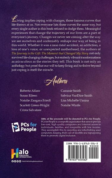 Living implies coping with changes, those famous curves that life throws at us. Not everyone hits those curves the same way, but every single author in this book refused to dodge them. Meaningful experiences that change the trajectory of our lives are a part of everyone's journey. Changes we never see coming alter the way we see ourselves and undeniably reshape our way of being in this world. Whether it was a near-fatal accident, an addiction, a loss of one's voice, or unexpected motherhood, the authors of The Journey is the Gift: The Moment that Changed My Story not only survived life-changing challenges, but embody vibrant transformations as miraculous as the stories they tell. This book is not only an anthology but proof that our will to keep living and to thrive beyond just coping is itself the miracle. AuthorsRoberto Alfaro Susan Eileen Natalie Zangara Friedl Scarlett Green-Wright Crista Salvatore Cammie Smith Sabrina VanDine Smith Lisa Michelle Umina Natalie Wintle