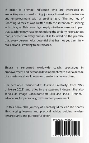 Even though the modern world is very loud and busy, there is a whisper that you can just barely make out. It talks about hidden goals, unrealized potential, and parts of the soul that haven't been explored yet. This soft voice invites us to go on a trip of self-discovery, a journey that will help us find the miracles that are hidden inside us. Welcome to Shipra Singh's "The Journey of Coaching Miracles," a journey that will change your life. Shipra, a renowned worldwide coach, specializes in empowerment and personal development. With over a decade of experience, she's known for transformative mentoring. Shipra's diverse educational background in computer engineering, law, and counselling psychology enriches her coaching approach. Her accolades include "Mrs Universe Creativity" from "Mrs Universe 2023" and titles in the pageant industry. She also serves as a POSH Trainer, Image Consultant, and Soft Skill Trainer, advocating for personal growth and empowerment. Each chapter in this book is like a guide that leads readers through different parts of being human, such as discovering our true potential, dealing with problems, and enjoying our successes. Shipra shows the way to self-actualization through moving stories, useful exercises, and tasks that will change your life. Keep going after your dreams, deal with problems with strength, and create a future that is even better than you imagined. Let's set sail together toward a horizon full of endless potential and hope.