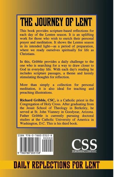 This book provides scripture-based reflections for each day of the Lenten season. It is an uplifting work for those who wish to enrich their personal prayer and meditation. It shows the Lenten season in its intended light -- as a period of preparation, where we ready ourselves spiritually for life as Christians. In this, Gribble provides a daily challenge to the one who is searching for a way to draw closer to God in everyday life. With each day's reading he includes scripture passages, a theme and keenly stimulating thoughts for reflection. More than simply a collection for personal meditation, it is also ideal for teaching and preaching illustrations. Richard Gribble, CSC, is a Catholic priest in the Congregation of Holy Cross. After graduating from the Jesuit School of Theology in Berkeley, he served at St. John Vianney in Goodyear, Arizona. Father Gribble is currently pursuing doctoral studies at the Catholic University of America in Washington DC. This is his third book.