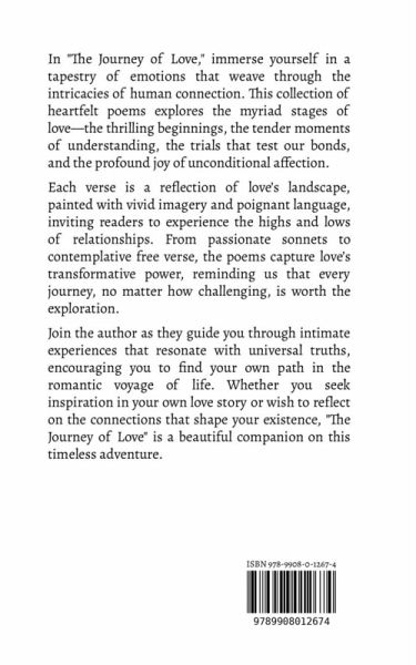 In "The Journey of Love," immerse yourself in a tapestry of emotions that weave through the intricacies of human connection. This collection of heartfelt poems explores the myriad stages of love-the thrilling beginnings, the tender moments of understanding, the trials that test our bonds, and the profound joy of unconditional affection. Each verse is a reflection of love's landscape, painted with vivid imagery and poignant language, inviting readers to experience the highs and lows of relationships. From passionate sonnets to contemplative free verse, the poems capture love's transformative power, reminding us that every journey, no matter how challenging, is worth the exploration. Join the author as they guide you through intimate experiences that resonate with universal truths, encouraging you to find your own path in the romantic voyage of life. Whether you seek inspiration in your own love story or wish to reflect on the connections that shape your existence, "The Journey of Love" is a beautiful companion on this timeless adventure.