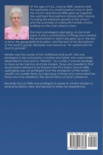 At the age of nine years, Dorcas Willis' parents took the pastorate of a small storefront church of about twenty-five people. She learned at an early age that when prayer is the cornerstone of a ministry, it is amazing what God can do. From that foundation, she watched God raise up a strong church. Both the church and Dorcas Willis grew up together. She watched God perform miracle after miracle, including the explosive growth of the church and the purchase of a beautiful ornate church building on the main street in town. She had a privileged upbringing. As she looks back, it was a combination of things that created the environment in which she grew up, the era of time, the geographical location, and the lack of an abundance of this world's goods. Necessity was viewed as "an opportunity for God to provide." Ministry was the center of her childhood and youth. She was privileged to be nurtured by a mother and father who were totally dedicated to prayer and "ministry." As a child, it was her privilege to have as her mentors and role models, those who dwelled in that secret place referred to by David in Psalm 91. Dorcas Willis' upbringing was not privileged from the standpoint of this world's wealth nor worldly fame but because of those who surrounded her, those who truly dwelled in the Secret Place of God's presence. The lesson she learned in growing up in a climate of prayer was that any interference with God's will and plan became null and void when prayer was made. Recently Dorcas Willis was privileged to speak to ministry le aders and share her experiences in several locations including Ireland and a missions trip to Ukraine. Because of the foundation of prayer through several generations, God has given her two sons who pastor thriving churches. Pastor Andrew J. Willis, who pastors in Houston, TX, and Pastor Dan Willis who pastors in the suburbs of Chicago, IL.
