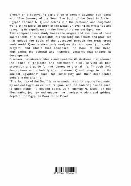 Embark on a captivating exploration of ancient Egyptian spirituality with "The Journey of the Soul: The Book of the Dead in Ancient Egypt." Thomas N. Quest delves into the profound and enigmatic world of the Egyptian Book of the Dead, unraveling its mysteries and revealing its significance in the lives of the ancient Egyptians.This comprehensive study traces the origins and evolution of these sacred texts, offering insights into the religious beliefs and practices that guided the souls of the deceased through the treacherous underworld. Quest meticulously analyzes the rich tapestry of spells, prayers, and rituals that composed the Book of the Dead, highlighting the cultural and historical contexts that shaped its development.Discover the intricate rituals and symbolic illustrations that adorned the tombs of pharaohs and commoners alike, serving as both protection and guide for the journey to eternal life. Through vivid descriptions and scholarly interpretations, Quest brings to life the ancient Egyptians' quest for immortality and their deep-seated beliefs in the afterlife."The Journey of the Soul" is an essential read for anyone fascinated by ancient Egyptian culture, religion, and the enduring human quest to understand life beyond death. Join Thomas N. Quest on this illuminating journey and uncover the timeless wisdom and spiritual depth of the Egyptian Book of the Dead.