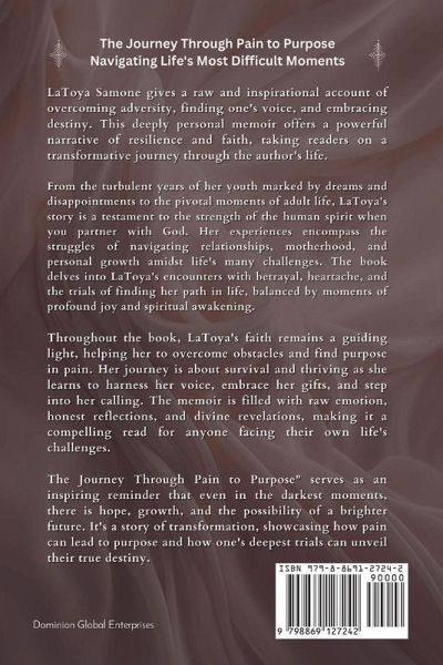 LaToya Samone gives a raw and inspirational account of overcoming adversity, finding one's voice, and embracing destiny. This deeply personal memoir offers a powerful narrative of resilience and faith, taking readers on a transformative journey through the author's life. From the turbulent years of her youth marked by dreams and disappointments to the pivotal moments of adult life, LaToya's story is a testament to the strength of the human spirit when you partner with God. Her experiences encompass the struggles of navigating relationships, motherhood, and personal growth amidst life's many challenges. The book delves into LaToya's encounters with betrayal, heartache, and the trials of finding her path in life, balanced by moments of profound joy and spiritual awakening. Throughout the book, LaToya's faith remains a guiding light, helping her to overcome obstacles and find purpose in pain. Her journey is about survival and thriving as she learns to harness her voice, embrace her gifts, and step into her calling. The memoir is filled with raw emotion, honest reflections, and divine revelations, making it a compelling read for anyone facing their own life's challenges. The Journey Through Pain to Purpose" serves as an inspiring reminder that even in the darkest moments, there is hope, growth, and the possibility of a brighter future. It's a story of transformation, showcasing how pain can lead to purpose and how one's deepest trials can unveil their true destiny.