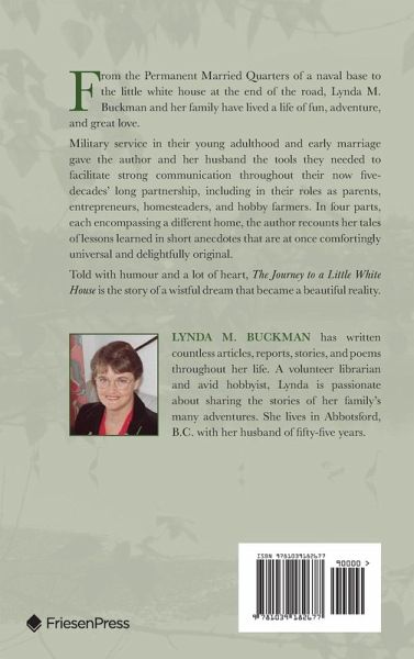 From the Permanent Married Quarters of a naval base to the little white house at the end of the road, Lynda M. Buckman and her family have lived a life of fun, adventure, and great love. Military service in their young adulthood and early marriage gave the author and her husband the tools they needed to facilitate strong communication throughout their now five-decades' long partnership, including in their roles as parents, entrepreneurs, homesteaders, and hobby farmers. In four parts, each encompassing a different home, the author recounts her tales of lessons learned in short anecdotes that are at once comfortingly universal and delightfully original. Told with humour and a lot of heart, The Journey to a Little White House is the story of a wistful dream that became a beautiful reality.