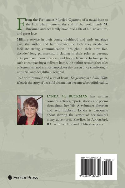 From the Permanent Married Quarters of a naval base to the little white house at the end of the road, Lynda M. Buckman and her family have lived a life of fun, adventure, and great love. Military service in their young adulthood and early marriage gave the author and her husband the tools they needed to facilitate strong communication throughout their now five-decades' long partnership, including in their roles as parents, entrepreneurs, homesteaders, and hobby farmers. In four parts, each encompassing a different home, the author recounts her tales of lessons learned in short anecdotes that are at once comfortingly universal and delightfully original. Told with humour and a lot of heart, The Journey to a Little White House is the story of a wistful dream that became a beautiful reality.