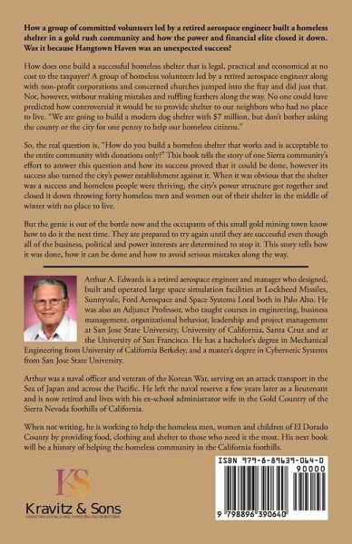 How a group of committed volunteers led by a retired aerospace engineer built a homeless shelter in a gold rush community and how the power and financial elite closed it down.Was it because Hangtown Haven was an unexpected success?How does one build a successful homeless shelter that is legal, practical and economical at no cost to the taxpayer? A group of homeless volunteers led by a retired aerospace engineer along with non-profit corporations and concerned churches jumped into the fray and did just that. Not, however, without making mistakes and ruffling feathers along the way. No one could have predicted how controversial it would be to provide shelter to our neighbors who had no place to live. "We are going to build a modern dog shelter with $7 million, but don't bother asking the county or the city for one penny to help our homeless citizens."So, the real question is, "How do you build a homeless shelter that works and is acceptable to the entire community with donations only?" This book tells the story of one Sierra community's effort to answer this question and how its success proved that it could be done, however its success also turned the city's power establishment against it. When it was obvious that the shelter was a success and homeless people were thriving, the city's power structure got together and closed it down throwing forty homeless men and women out of their shelter in the middle of winter with no place to live.But the genie is out of the bottle now and the occupants of this small gold mining town know how to do it the next time. They are prepared to try again until they are successful even though all of the business, political and power interests are determined to stop it. This story tells how it was done, how it can be done and how to avoid serious mistakes along the way.