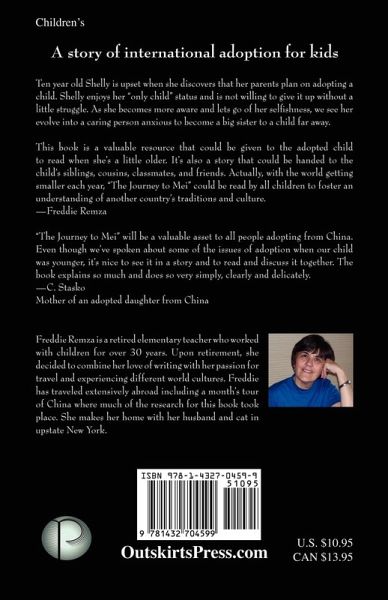 A story of international adoption for kids Ten year old Shelly is upset when she discovers that her parents plan on adopting a child. Shelly enjoys her 'only child' status and is not willing to give it up without a little struggle. As she becomes more aware and lets go of her selfishness, we see her evolve into a caring person anxious to become a big sister to a child far away. This book is a valuable resource that could be given to the adopted child to read when she's a little older. It's also a story that could be handed to the child's siblings, cousins, classmates, and friends. Actually, with the world getting smaller each year, "The Journey to Mei" could be read by all children to foster an understanding of another country's traditions and culture. - Freddie Remza "The Journey to Mei" will be a valuable asset to all people adopting from China. Even though we've spoken about some of the issues of adoption when our child was younger, it's nice to see it in a story and to read and discuss it together. The book explains so much and does so very simply, clearly and delicately. - C. Stasko Mother of an adopted daughter from China
