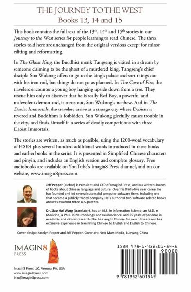 This book contains the full text of the 13th, 14th and 15th stories in our Journey to the West series for people learning to read Chinese. The three stories told here are unchanged from our original versions except for minor editing and reformatting. In The Magic Ginseng Tree, the Buddhist monk Tangseng is visited in a dream by someone claiming to be the ghost of a murdered king. Tangseng's chief disciple Sun Wukong offers to go to the king's palace and sort things out with his iron rod, but things do not go as planned. In The Cave of Fire, the travelers encounter a young boy hanging upside down from a tree. They rescue him only to discover that he is really Red Boy, a powerful and malevolent demon and, it turns out, Sun Wukong's nephew. And in The Daoist Immortals, the travelers arrive at a strange city where Daoism is revered and Buddhism is forbidden. Sun Wukong gleefully causes trouble in the city, and finds himself in a series of deadly competitions with three Daoist Immortals. The stories are written, as much as possible, using the 1200-word vocabulary of HSK4 plus several hundred additional words introduced in these books and earlier books in the series. It is presented in Simplified Chinese characters and pinyin, and includes an English version and complete glossary. Free audiobooks are available on YouTube's Imagin8 Press channel, and on our website, www.imagin8press.com.