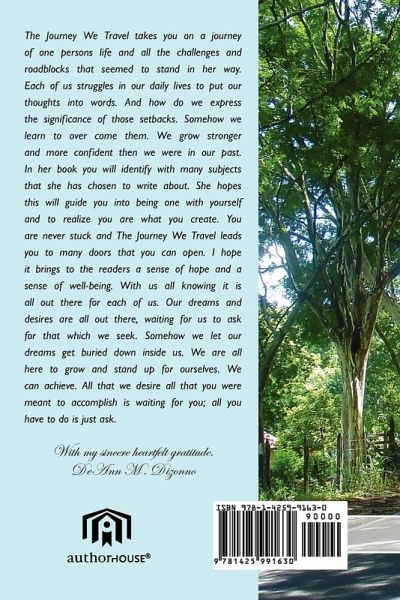 The Journey We Travel takes you on a journey of one persons life and all the challenges and roadblocks that seemed to stand in her way. Each of us struggles in our daily lives to put our thoughts into words. And how do we express the significance of those setbacks. Somehow we learn to over come them. We grow stronger and more confident then we were in our past. In her book you will identify with many subjects that she has chosen to write about. She hopes this will guide you into being one with yourself and to realize you are what you create. You are never stuck and The Journey We Travel leads you to many doors that you can open. I hope it brings to the readers a sense of hope and a sense of well-being. With us all knowing it is all out there for each of us. Our dreams and desires are all out there, waiting for us to ask for that which we seek. Somehow we let our dreams get buried down inside us. We are all here to grow and stand up for ourselves. We can achieve. All that we desire all that you were meant to accomplish is waiting for you; all you have to do is just ask. With my sincere heartfelt gratitude, DeAnn M. Dizonno