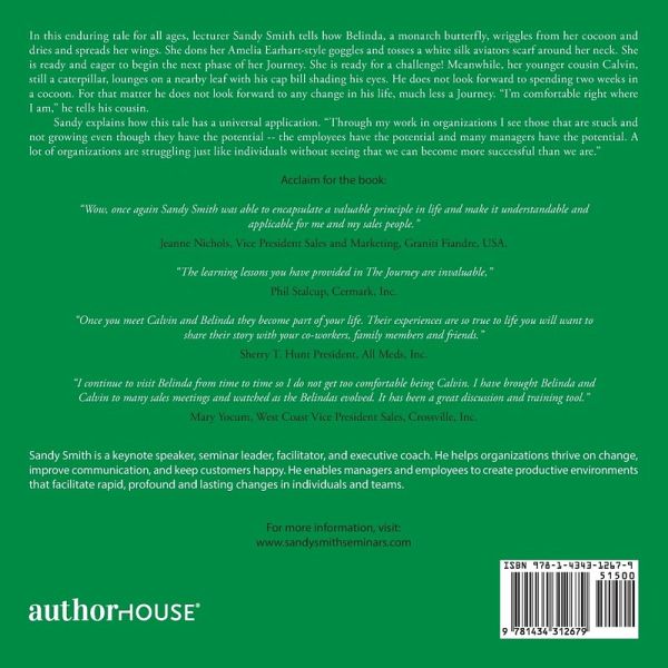 In this enduring tale for all ages, lecturer Sandy Smith tells how Belinda, a monarch butterfly, wriggles from her cocoon and dries and spreads her wings. She is ready and eager to begin the next phase of her Journey. She is ready for a challenge! Meanwhile, her younger cousin Calvin, still a caterpillar, lounges on a nearby leaf with his cap bill shading his eyes. He does not look forward to any change in his life, much less a Journey. "I'm comfortable right where I am," he tells his cousin. Sandy explains how this tale has a universal application. "Through my work in organizations I see those that are stuck and not growing even though they have the potential -- the employees have the potential and many managers have the potential. A lot of organizations are struggling just like individuals without seeing that we can become more successful than we are." Acclaim for the book: "Wow, once again Sandy Smith was able to encapsulate a valuable principle in life and make it understandable and applicable for me and my sales people." Jeanne Nichols, Vice President Sales and Marketing, Graniti Fiandre, USA "The learning lessons you have provided in The Journey are invaluable," Phil Stalcup, Cermark, Inc. "Once you meet Calvin and Belinda they become part of your life. Their experiences are so true to life you will want to share their story with your co-workers, family members and friends." Sherry T. Hunt President, All Meds, Inc. "I continue to visit Belinda from time to time so I do not get too comfortable being Calvin. I have brought Belinda and Calvin to many sales meetings and watched as the Belindas evolved. It h