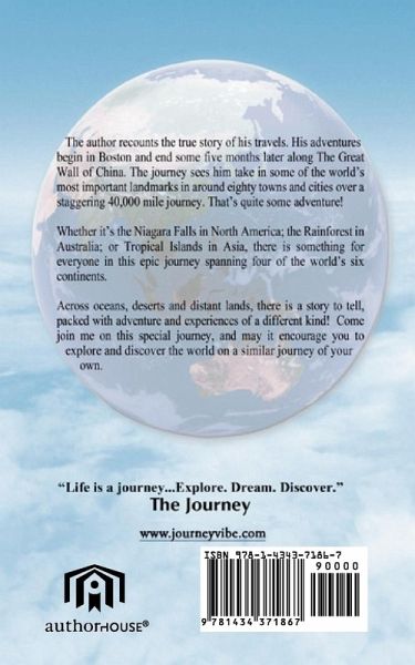 The author recounts the true story of his travels. His adventures begin in Boston and end some five months later along The Great Wall of China. The journey sees him take in some of the world's most important landmarks in around eighty towns and cities over a staggering 40,000 mile journey. That's quite some adventure! Whether it's the Niagara Falls in North America, the Rainforest in Australia, or Tropical Islands in Asia, there is something for everyone in this epic journey spanning four of the world's six continents. Across oceans, deserts and distant lands, there is a story to tell, packed with adventure and experiences of a different kind. Come join me on this special journey, and may it encourage you to explore and discover the world on a similar journey of your own.