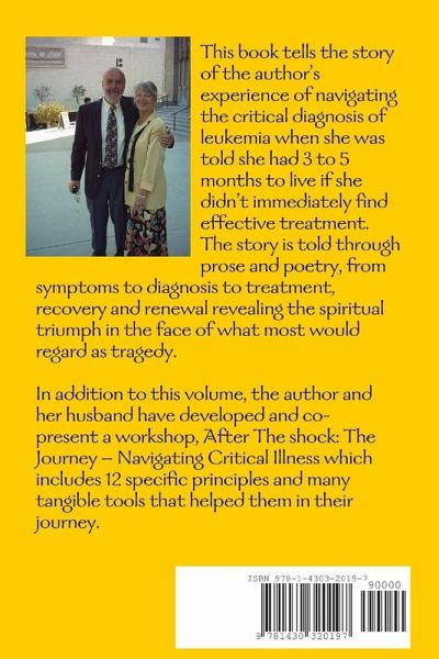 This book tells the story of the author's experience of navigating the critical diagnosis of leukemia when she was told she had 3 to 5 months to live if she didn't immediately find effective treatment. The story --- from symptoms to diagnosis to treatment, recovery and renewal --- is told through prose and poetry. Proceeds from the sale of this book to benefit Fred Hucthinson Cancer Research Center, Seattle, Washington