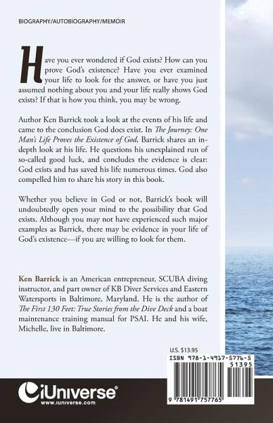 Have you ever wondered if God exists? How can you prove God's existence? Have you ever examined your life to look for the answer, or have you just assumed nothing about you and your life really shows God exists? If that is how you think, you may be wrong. Author Ken Barrick took a look at the events of his life and came to the conclusion God does exist. In The Journey: One Man's Life Proves the Existence of God, Barrick shares an in-depth look at his life. He questions his unexplained run of so-called good luck, and concludes the evidence is clear: God exists and has saved his life numerous times. God also compelled him to share his story in this book. Whether you believe in God or not, Barrick's book will undoubtedly open your mind to the possibility that God exists. Although you may not have experienced such major examples as Barrick, there may be evidence in your life of God's existence-if you are willing to look for them.