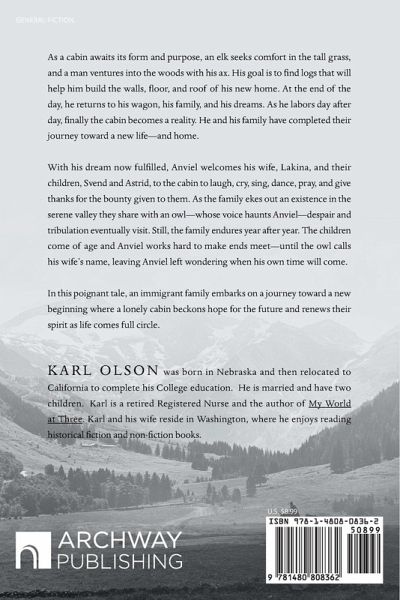 As a cabin awaits its form and purpose, an elk seeks comfort in the tall grass, and a man ventures into the woods with his ax. His goal is to find logs that will help him build the walls, floor, and roof of his new home. At the end of the day, he returns to his wagon, his family, and his dreams. As he labors day after day, finally the cabin becomes a reality. He and his family have completed their journey toward a new life-and home. With his dream now fulfilled, Anviel welcomes his wife, Lakina, and their children, Svend and Astrid, to the cabin to laugh, cry, sing, dance, pray, and give thanks for the bounty given to them. As the family ekes out an existence in the serene valley they share with an owl-whose voice haunts Anviel-despair and tribulation eventually visit. Still, the family endures year after year. The children come of age and Anviel works hard to make ends meet-until the owl calls his wife's name, leaving Anviel left wondering when his own time will come. In this poignant tale, an immigrant family embarks on a journey toward a new beginning where a lonely cabin beckons hope for the future and renews their spirit as life comes full circle.
