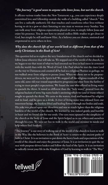 "The Journey" is good news to anyone who loves Jesus, but not the church. It affirms various truths from the New Testament; e.g., you can experience deeply committed love and fellowship outside the walls of a building called "church." You can live a radically authentic life that touches and transforms other lives without having to sit in a pew or chair listening to one man or woman every Sunday. You can walk away from religious expectations placed on you, to simply follow Jesus and enjoy his presence. You do not have to attend endless Bible studies to get closer to God, but simply be still and know Him. As a believer you are chosen, anointed and empowered to serve others in love. Why does the church life of our world look so different from that of the early Christians in the Book of Acts? This question led us to explore the very foundations of the church and we decided to follow Jesus wherever that will take us. We stepped out of the world of the church, for we began to see that most of what we had invested our lives in had more in common with the world than with the Word of God. Like Paul when he met the risen Lord on the way to Damascus and counted all he had as a religious Pharisee as garbage, we too walked away from religion to pursue Jesus. When we chose not to be purpose-driven, we were set free to be Spirit-led! We stepped off the religious treadmill of the same old, same old year-round unproductive programs and away from the futility of trying to meet people's expectations. We found the one who offered us living water to quench the thirst. It tasted so different than the "holy water" poured from the religious buckets of some big-name leader's anointing which we (and so many others) sought to quench the thirst. We came to the waters, tired and burdened by religion and its load, and he gave us a drink. A river of living water was released from our innermost beings, the burdens lifted and healing flowed through our bodies and souls. His yoke was placed upon our shoulders and was so much lighter than the religious burdens of the world of the church. We learned he was indeed gentle and humble in heart and we found rest for our souls. Our eyes were opened to the simplicity of the church as the body of Jesus and the Spirit helped us to see others and ourselves through his eyes. We were set free to walk in the world and minister to needs and help others find freedom. "The Journey" is our story walking out of the world of the church to learn to walk in the Way, like the believers in the Book of Acts-a return to the ancient paths of faith in Christ. It an invitation to put down the heavy loads and expectations of the world of the church and enjoy the presence of Jesus. It is an invitation to quit the rat race with purpose-driven leaders and follow the lead of the Spirit. It is an invitation to radically invest your life in the Kingdom of God by learning to walk in "The Way."