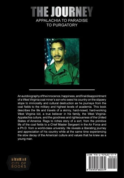 An autobiography of the innocence, happiness, and final disappointment of a West Virginia coal miner's son who sees his country on the slippery slope to immorality and cultural destruction as he journeys from the coal fields to the military and highest levels of academia. This book describes the life and travels of a skinny, hard-nosed, hard-working West Virginia kid, a true believer in his family, the West Virginia-Appalachia culture, and the goodness and righteousness of the United States of America. Rags to riches story of a sort, from the primitive life of the coal fields to a Chief Master Sergeant in the Air Force and a Ph.D. from a world-class university. He reveals a liberating journey and appreciation of his country while at the same time experiencing the slow decay of the American culture and values that he knew as a young man.