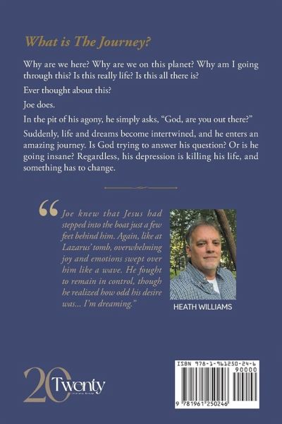 What is The Journey? Why are we here? Why are we on this planet? Why am I going through this? Is this really life? Is this all there is? Ever thought about this? Joe does. In the pit of his agony, he simply asks, "God, are you out there?" Suddenly, life and dreams become intertwined, and he enters an amazing journey. Is God trying to answer his question? Or is he going insane? Regardless, his depression is killing his life, and something has to change. Joe knew that Jesus had stepped into the boat just a few feet behind him. Again, like at Lazarus' tomb, overwhelming joy and emotions swept over him like a wave. He fought to remain in control, though he realized how odd his desire was... I'm dreaming."