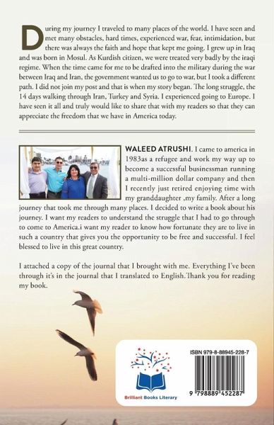 During my journey I traveled to many places of the world. I have seen and met many obstacles, hard times, experienced war, fear, intimidation, but there was always the faith and hope that kept me going. I grew up in Iraq and was born in Mosul. As Kurdish citizen, we were treated very badly by the Iraqi regime. When the time came for me to be drafted into the military during the war between Iraq and Iran, the government wanted us to go to war, but I took a di¿erent path. I did not join my post and that is when my story began. The long struggle, the 14 days walking through Iran, Turkey and Syria. I experienced going to Europe. I have seen it all and truly would like to share that with my readers so that they can appreciate the freedom that we have in America today.